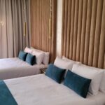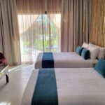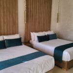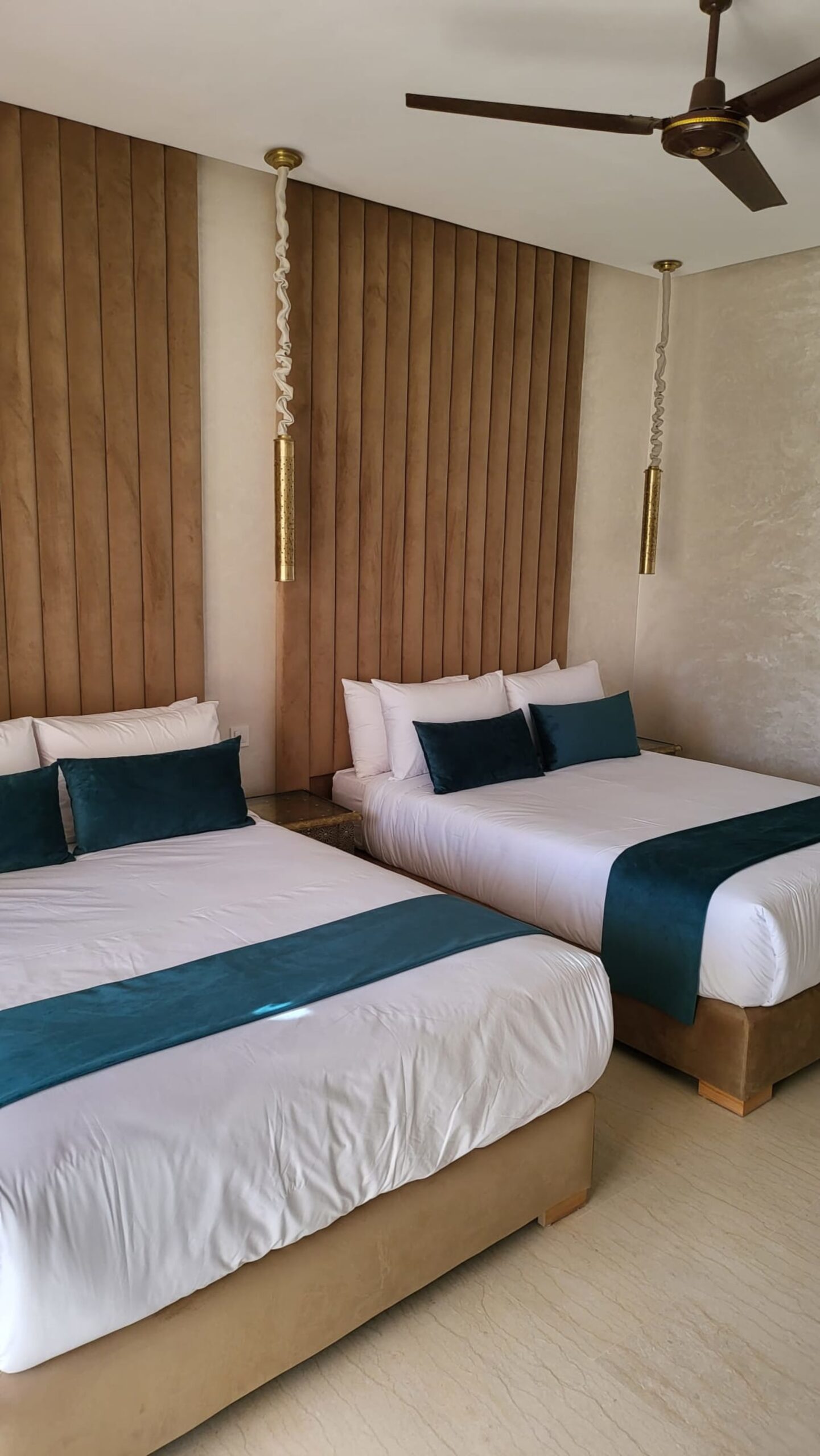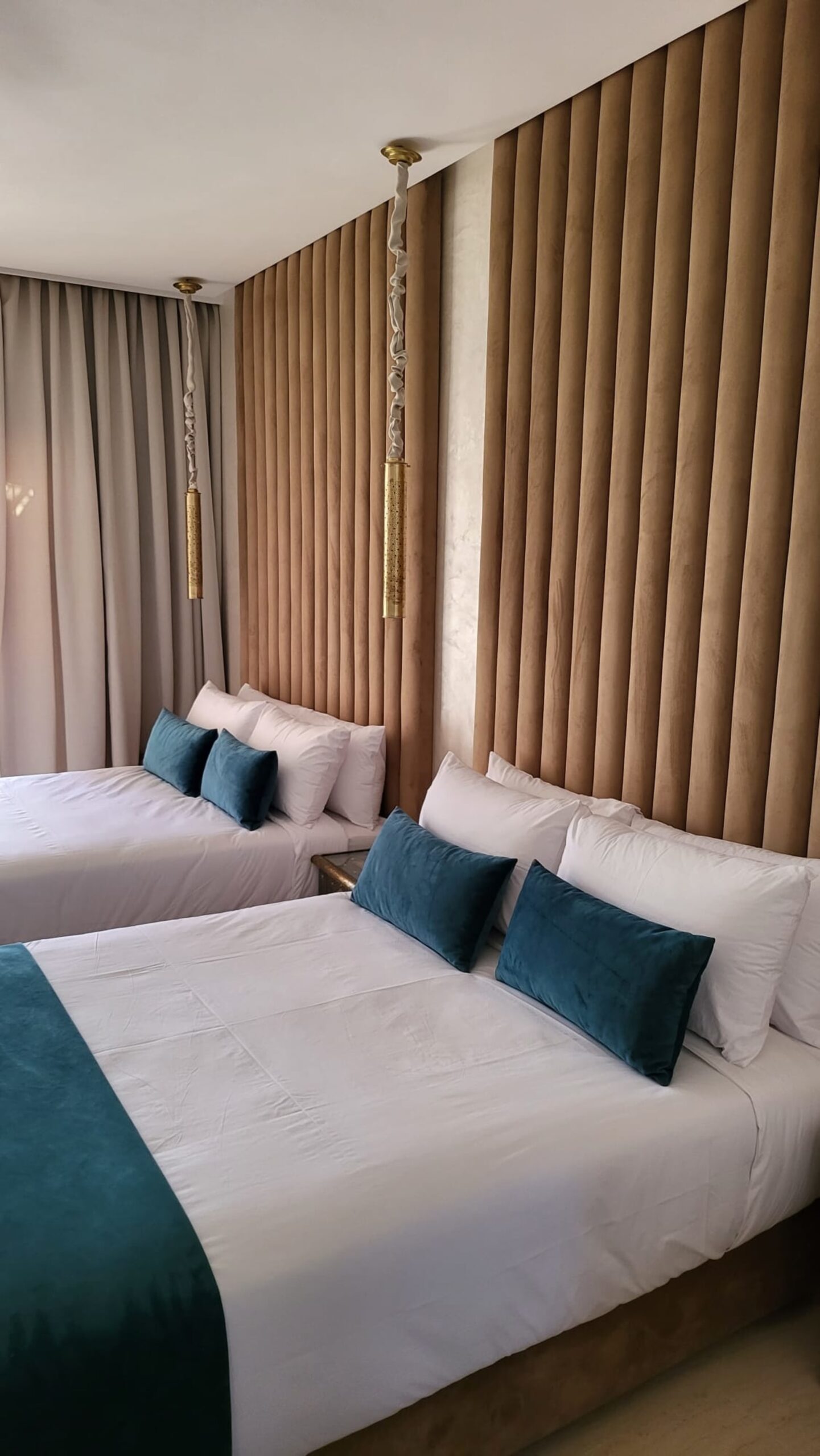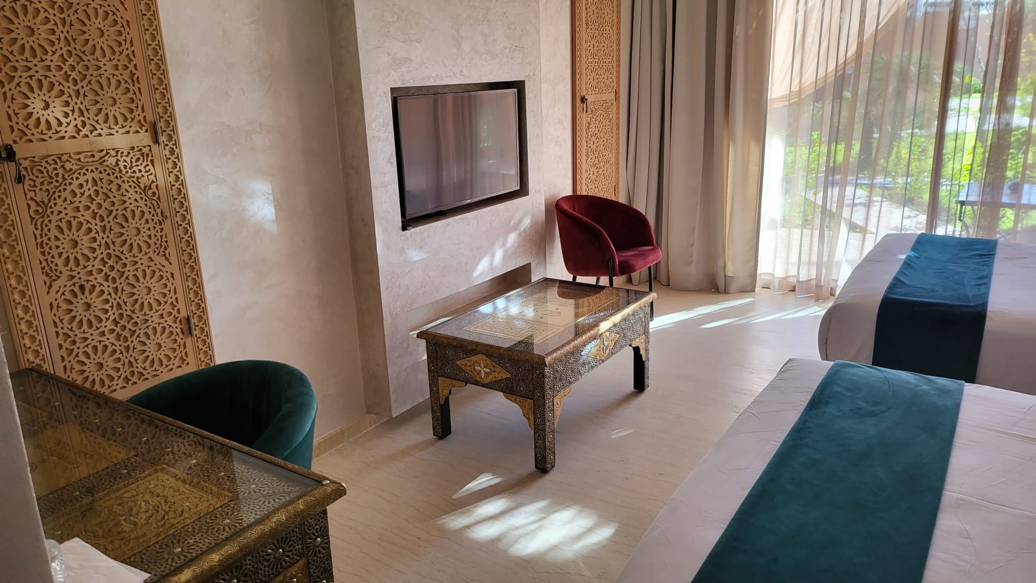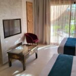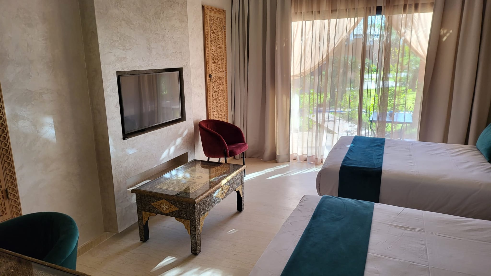 La Chambre Familiale de 39 m² est conçue pour accueillir jusqu’à quatre personnes, offrant un espace généreux et convivial pour les familles ou les groupes d’amis. Elle dispose de deux grands lits doubles, garantissant confort et repos à chaque occupant. La chambre bénéficie d’une vue sur le jardin et la piscine et s’ouvre sur une terrasse privée aménagée avec table et chaises, idéale pour profiter de l’extérieur.