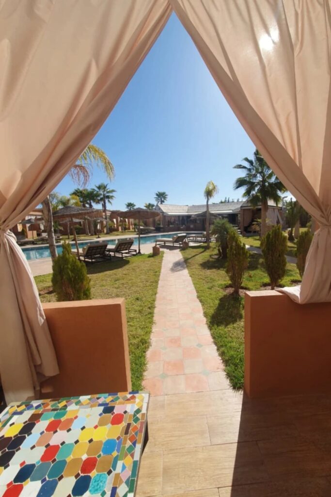 Elle dispose de deux grands lits doubles, d’une terrasse privée aménagée et offre une vue directe sur le jardin et la piscine, pour un séjour à la fois convivial et reposant.